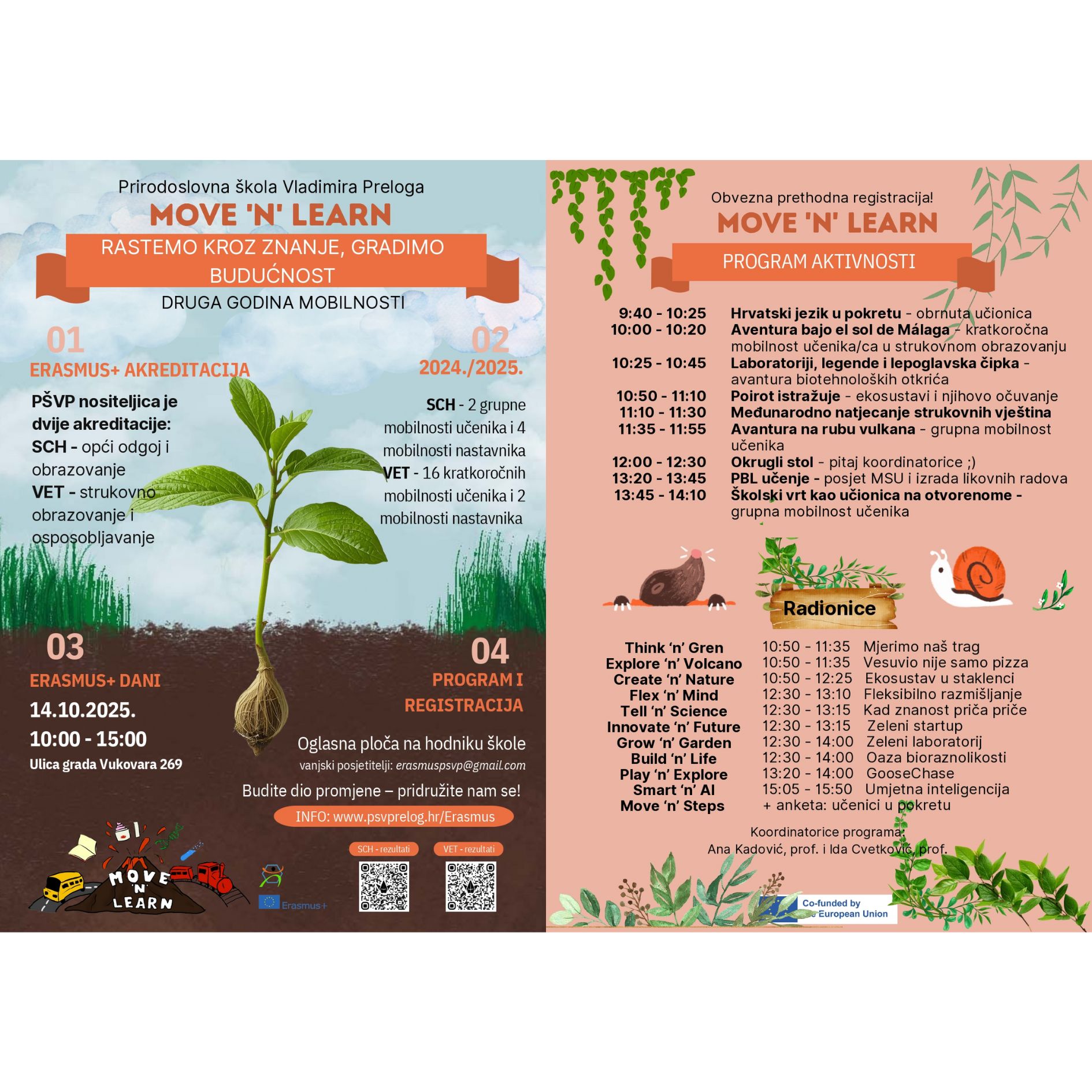 Ove godine s ponosom predstavljamo drugi ciklus našeg projekta Move ‘n’ learn pod nazivom „Rastemo kroz znanje, gradimo budućnost: Druga godina mobilnosti“. Cilj nam je široj javnosti prikazati kako međunarodne mobilnosti unapređuju obrazovne vještine učenika i nastavnika te otvaraju nove mogućnosti za profesionalni razvoj. Kroz raznovrsne aktivnosti, učenici i nastavnici podijelit će svoja iskustva, izazove i postignuća stečena tijekom mobilnosti u inozemstvu. Ovi Otvoreni dani predstavljaju nastavak našeg petogodišnjeg puta rasta, suradnje i stvaranja pozitivnih promjena u školi i lokalnoj zajednici. Dugoročni cilj projekta je stvaranje samoodrživog obrazovnog ekosustava koji će našim učenicima omogućiti uspješan profesionalni razvoj. Pozivamo vas da nam se pridružite i saznate više o tome kako mobilnosti oblikuju budućnost!